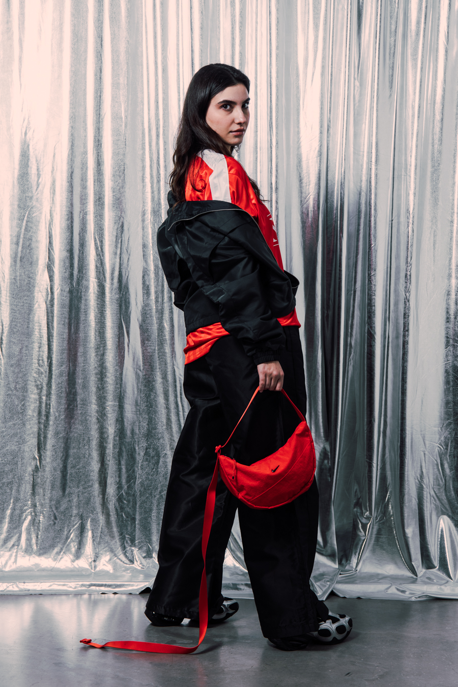 Το the sweatshirt από την ίδια συλλογή είναι η τελική πινελιά — μινιμαλιστικό, αλλά με έντονη παρουσία. Είναι ένα από εκείνα τα κομμάτια που απλώς νιώθεις ότι σου ανήκουν. Από μέσα φοράω το κλασικό μπλουζάκι V-Neck , που προσθέτει μια ανάλαφρη, εύκολη στρώση — μια μικρή αλλά σημαντική λεπτομέρεια. Και η τσάντα Nike Aura Crescent Crossbody είναι το τελικό μου αξεσουάρ. Συμπαγής, λειτουργική και ακριβώς στο σωστό μέγεθος για ό,τι χρειάζομαι όταν είμαι σε κίνηση.